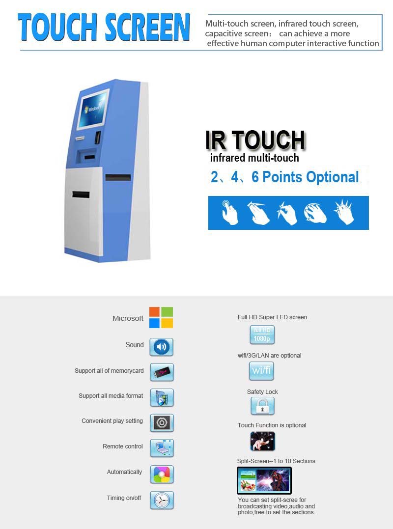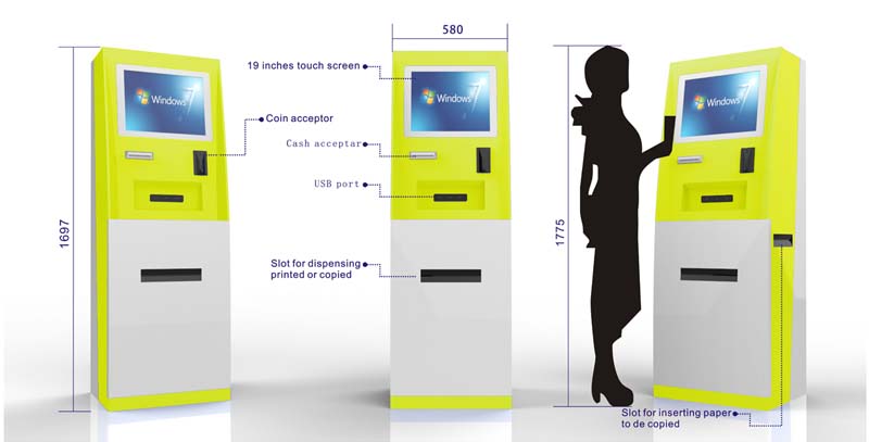 The self-service kiosk has a magnificent appearance with attractive design, delicate and beautiful. Out shell designed with high-quality cold rolling plate, the surface of industrial-grade paint designed to guarantee protection against rust and increase durability. It contains High-performance low-power industrial-grade motherboard simple fast and stable, to meet more daily operational needs